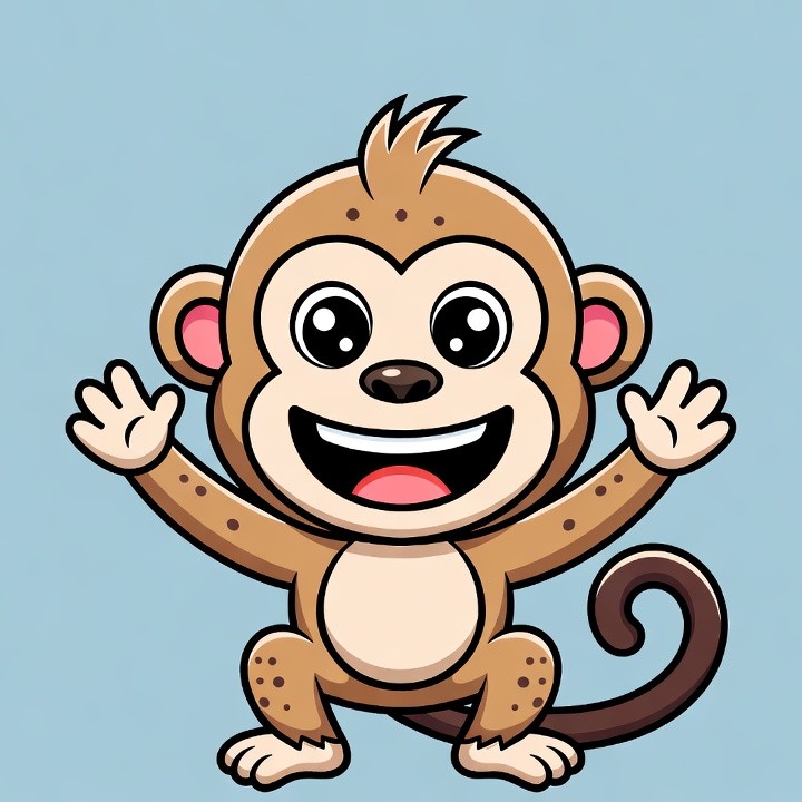 animal, big eyes, brown monkey, cartoon monkey, clipart, curly tail, cute monkey, fun monkey, happy monkey, illustration, isolated background, kawaii monkey, pink ears, smiling monkey, vector monkey, waving monkey, monkey