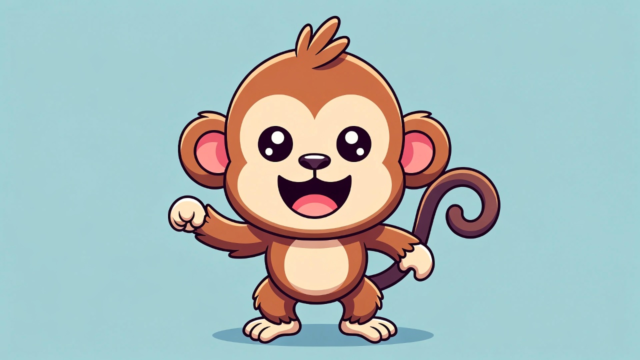 A kawaii-style cartoon monkey with brown fur and big sparkling eyes waves happily on a light blue background. It has a wide smiling mouth, pink cheeks, and a curly tail. The chibi illustration features stubby arms and legs in a playful pose.