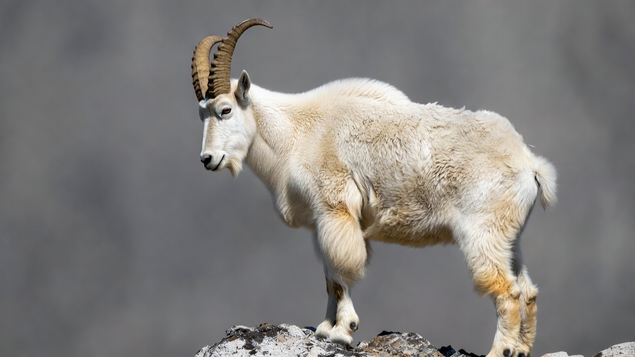 animal, big horns, curved horns, goat, isolated background, mountain goat, mountains, nature, outdoors, rocky outcrop, sheep, standing, white fur, wildlife, Dall sheep