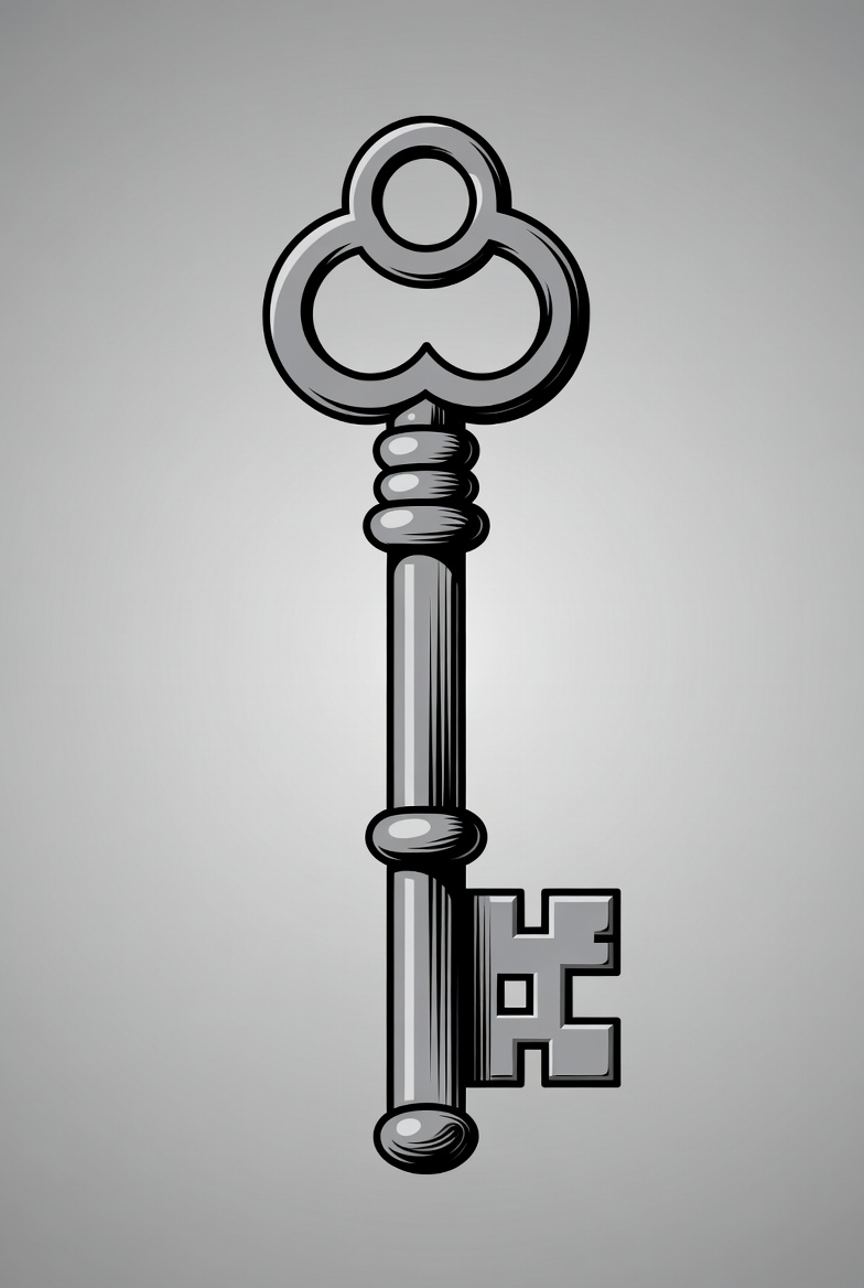A detailed line art illustration of a vintage skeleton key in gray tones. The key features an ornate loop at the top and a jagged blade at the bottom. It is centered on a solid gray background.