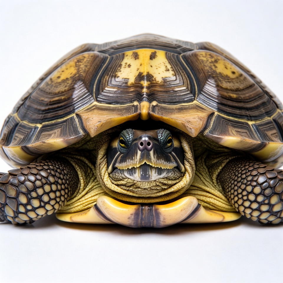 A turtle with a brown and yellow patterned shell faces forward on a plain white background. Its head protrudes from the shell, showing green eyes, a yellow beak, and textured skin. The legs are tucked under the body with detailed scales visible.
