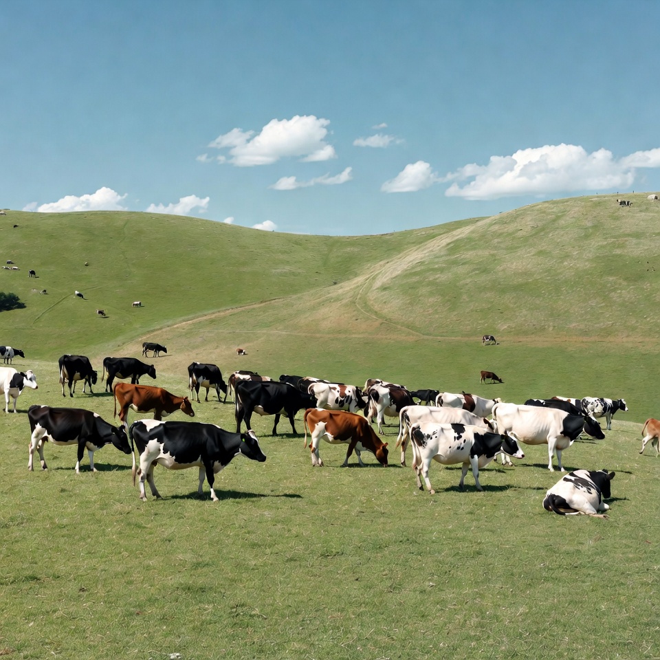 A large herd of black and white Holstein cows grazes on lush green rolling hills under a clear blue sky with scattered clouds. Some cows stand and eat grass while others rest on the ground. Additional cows dot the distant hillsides.