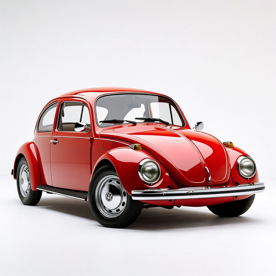 Beetle car, VW Beetle, beetle bug, chrome trim, classic car, compact car, isolated car, red Volkswagen, red car, round headlights, shiny paint, two-door car, vintage car, white background, whitewall tires, Volkswagen Beetle