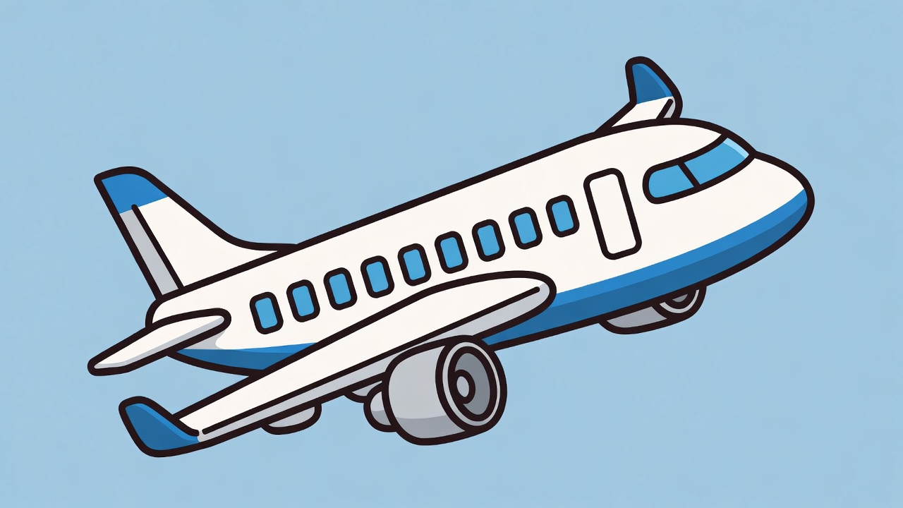A white cartoon airplane with blue accents flies sideways against a light blue background. It features detailed windows, wings, engines, and tail fins in a simple line art style. The illustration is isolated with no other elements.