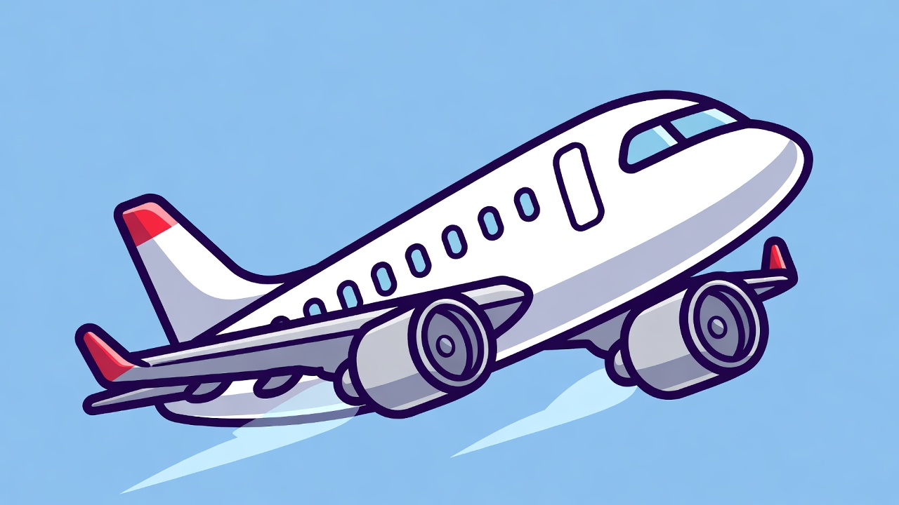 A white cartoon airplane with red tail accents is taking off at an angle against a light blue sky background. It features detailed windows along the fuselage, spinning propellers on the engines, and motion lines indicating flight. The illustration style is simple and colorful with bold outlines.