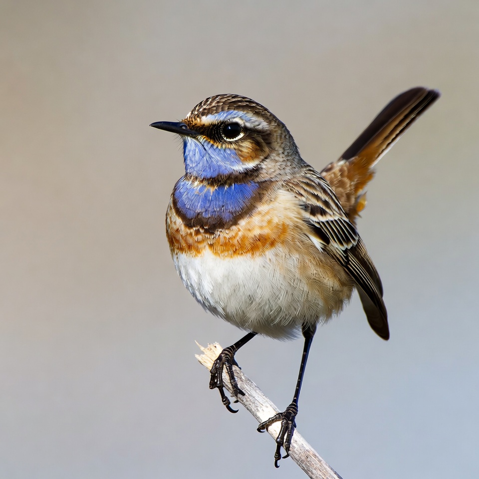 avian, bird, blue throat, branch, brown bird, dark wings, eye stripe, feathers, isolated background, nature, orange feathers, perching, sharp beak, small bird, songbird, white belly, wildlife, whistling thrush