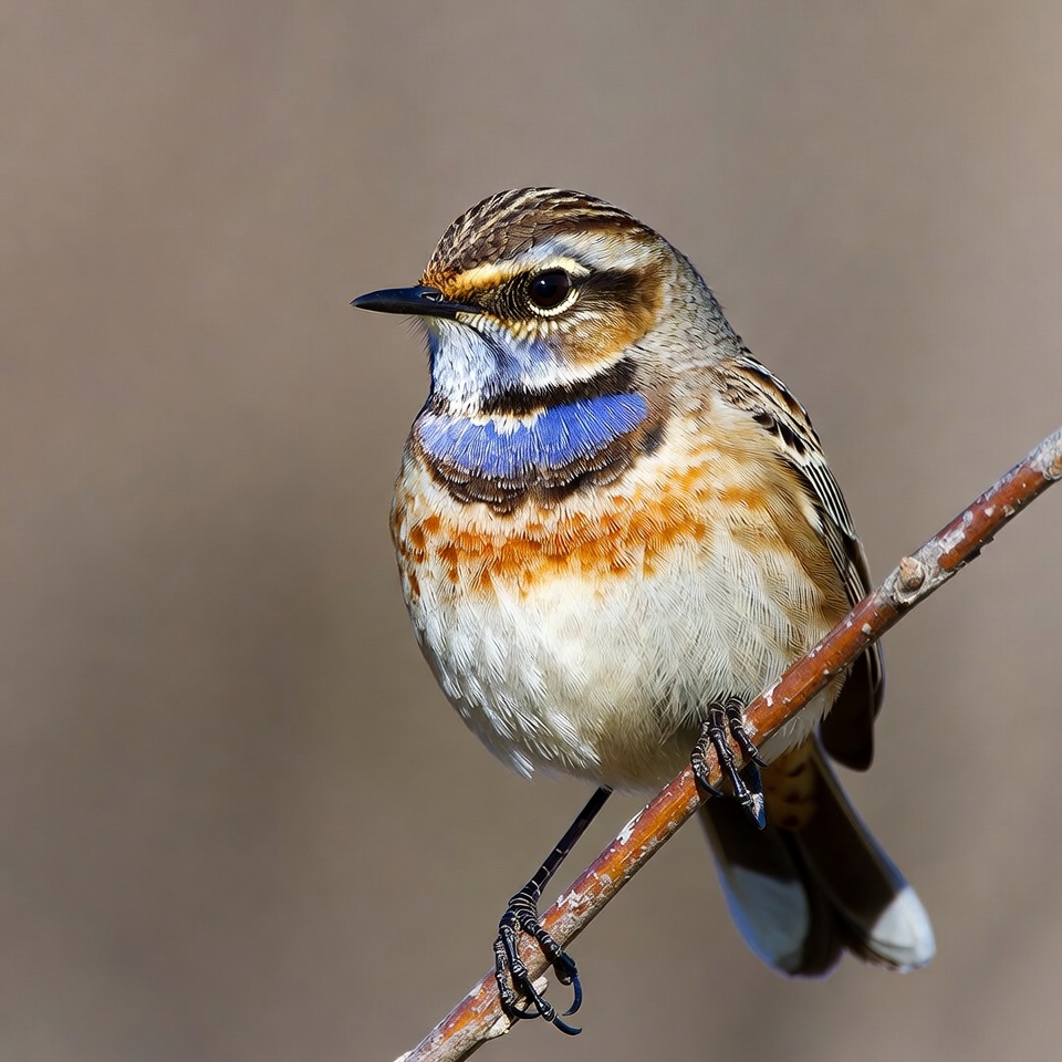 avian, bird, black bill, blue throat, branch, eye stripe, feathers, isolated background, nature, orange breast, passerine, perching, songbird, striped head, white belly, wildlife, whinchat