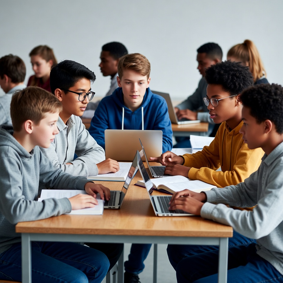 A diverse group of high school students sits around a wooden table in a classroom, working together on laptops and notebooks. They wear casual hoodies and jeans, with some using pens to take notes. The bright room has white walls and additional students visible in the background.