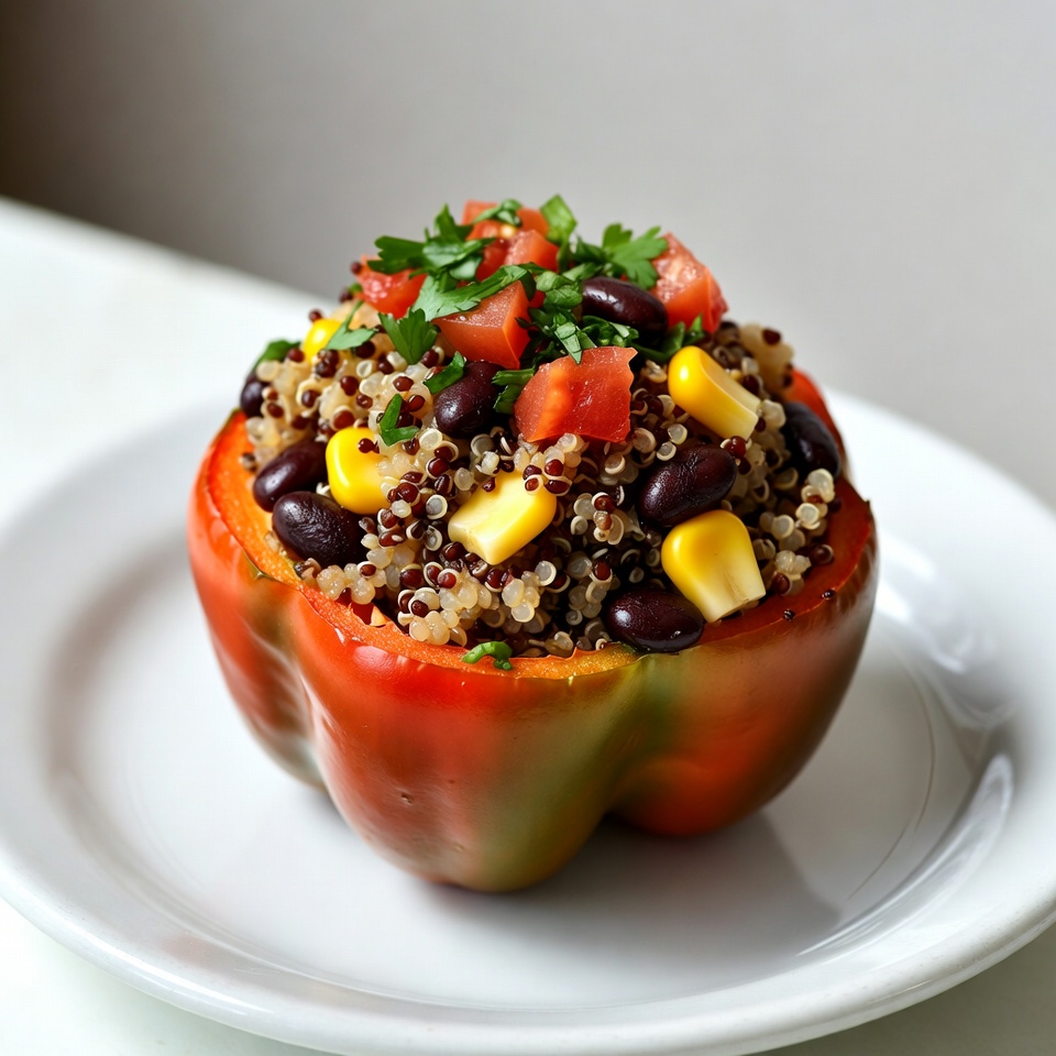 A vibrant red bell pepper is stuffed with quinoa, black beans, corn kernels, and diced tomatoes. Fresh parsley and tomato pieces garnish the top. The dish sits on a white plate against a light background.
