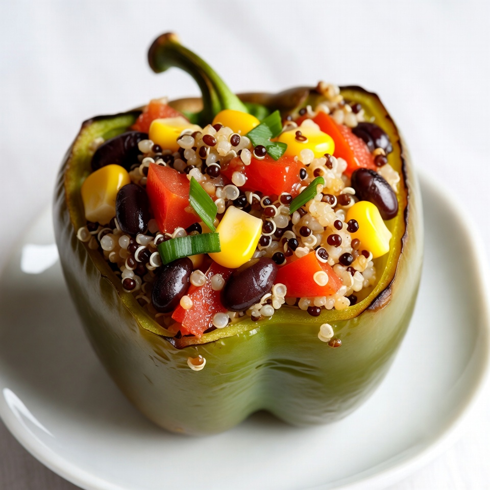 A green bell pepper is stuffed with a colorful quinoa salad featuring black beans, corn kernels, diced tomatoes, and green onions. The pepper sits on a white plate with a clean background. The filling is vibrant with red tomatoes, yellow corn, and speckled quinoa grains.