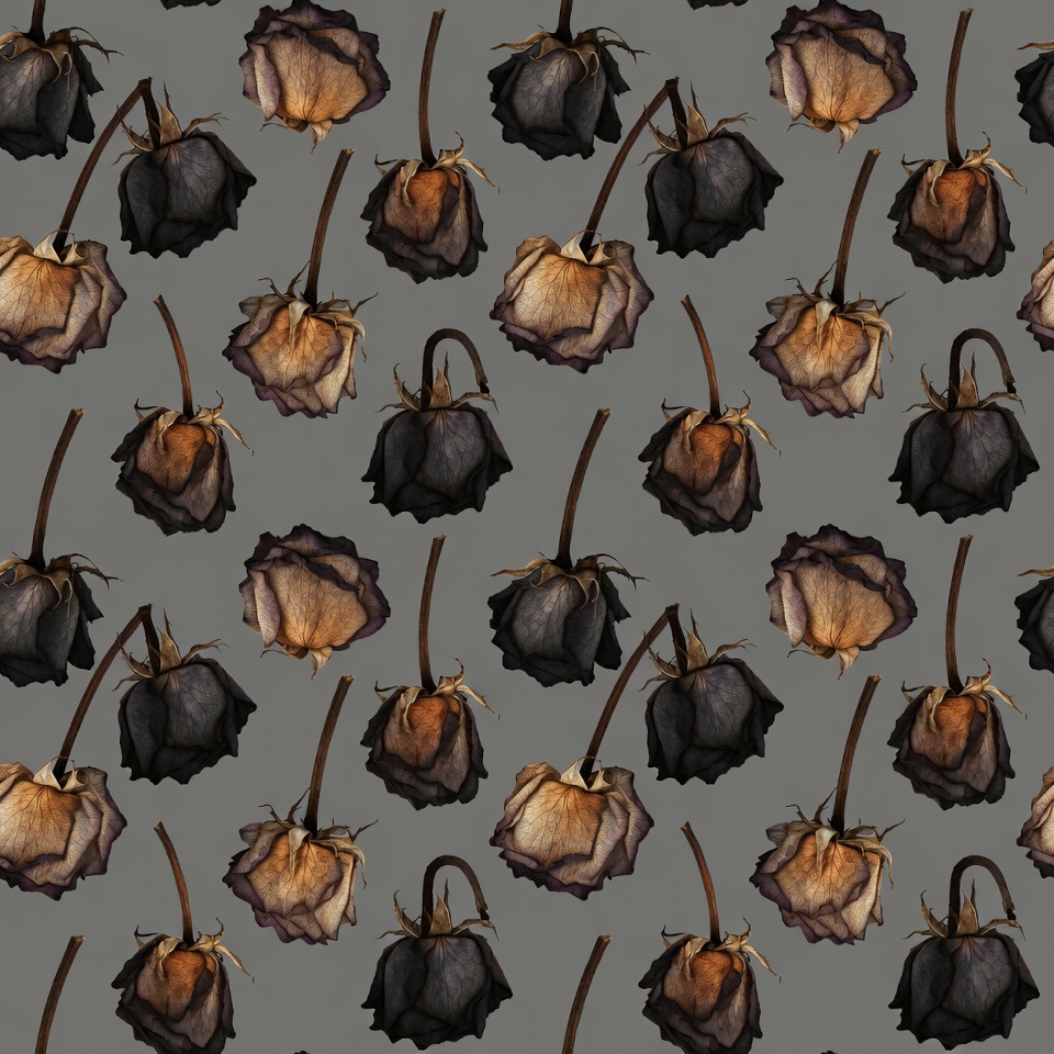 A seamless pattern features numerous wilted black roses with dark, dried petals scattered across a gray background. The roses have thin stems and slightly curled leaves. The arrangement creates a repeating floral design in shades of black, brown, and gray.