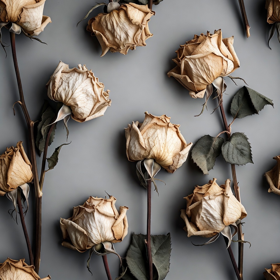 beige flowers, beige roses, dried flowers, flat lay, floral pattern, flower arrangement, flowers, gray background, isolated background, leaves, petals, roses, stems, thorny stems, wilted roses, dried roses