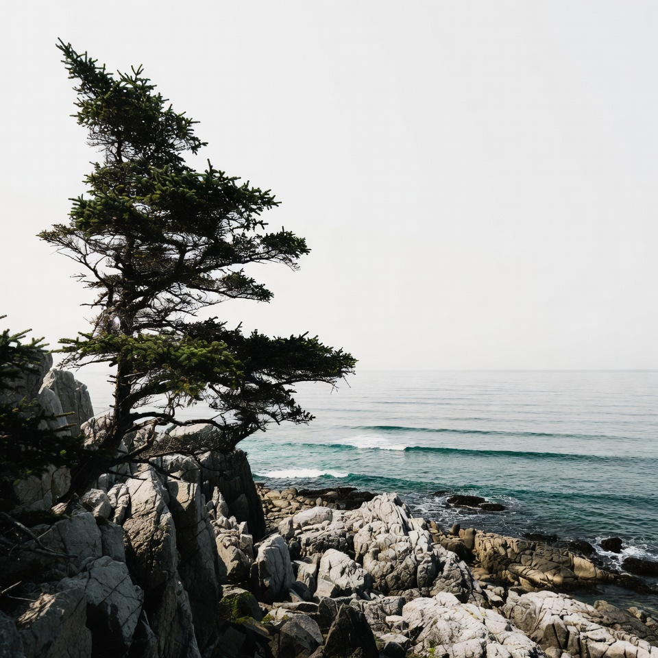 A tall pine tree with dense green branches grows on a rocky cliff overlooking the ocean. Gentle waves crash against the rocks below, with a foggy horizon in the background. The scene features gray rocks, blue-green sea, and a white sky.