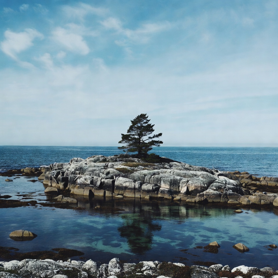 blue sky, clouds, coast, evergreen tree, island, landscape, lone tree, nature, ocean, reflection, rocks, rocky island, sea, seascape, solitude, stone island, tree island, turquoise water, water, pine tree