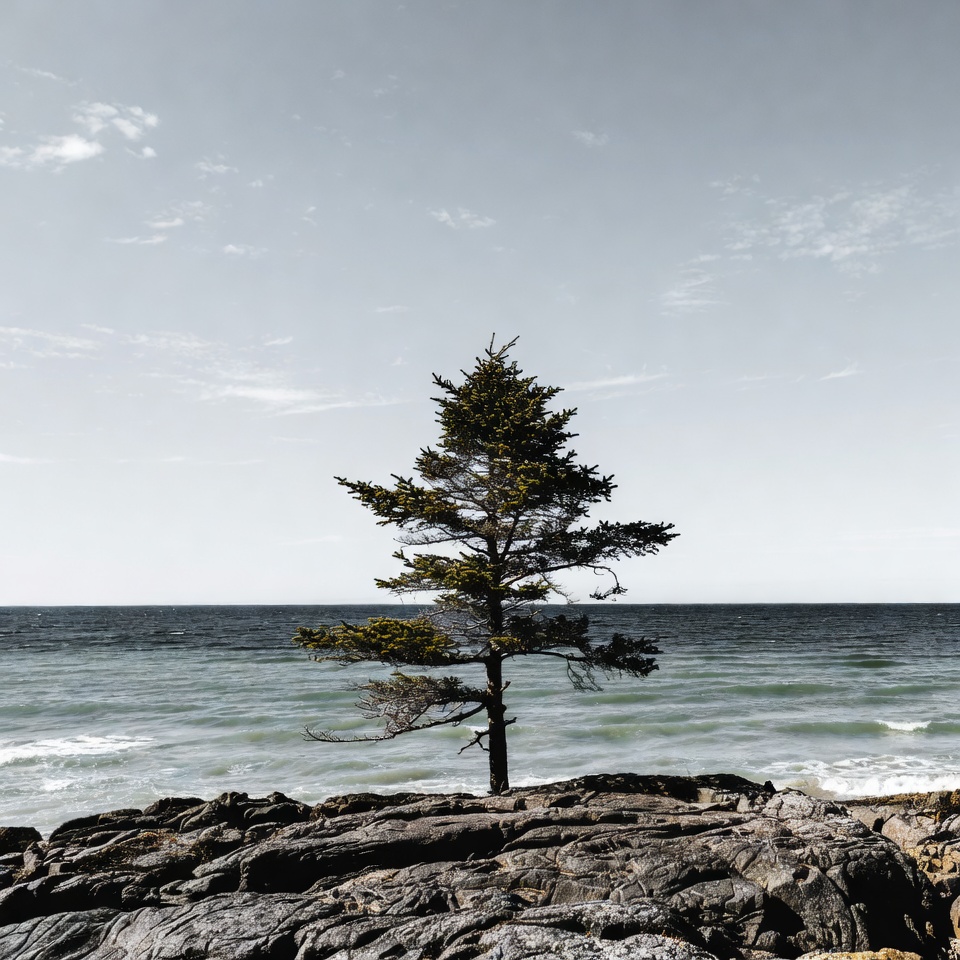 A solitary pine tree stands prominently on a rocky cliff overlooking the ocean. The tree features dense green needles and a conical shape against a partly cloudy sky. Gentle waves crash on the rocks below the seaside landscape.