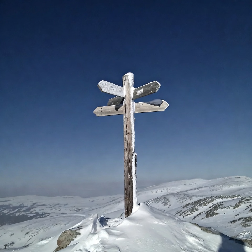 A wooden signpost with multiple directional arms covered in snow stands on a snowy mountain peak. The arms point in different directions against a clear blue sky. Snow-covered mountains stretch into the distance below.