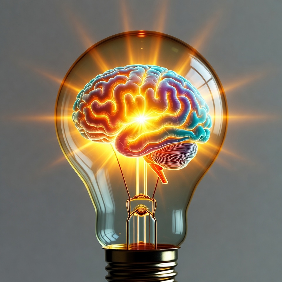 A colorful human brain with vibrant pink, blue, and orange hues glows brightly inside a transparent glass lightbulb. The lightbulb emits radiant yellow light from the brain's core, set against a neutral gray background. Detailed neural folds and glowing effects emphasize the fusion of intellect and innovation.