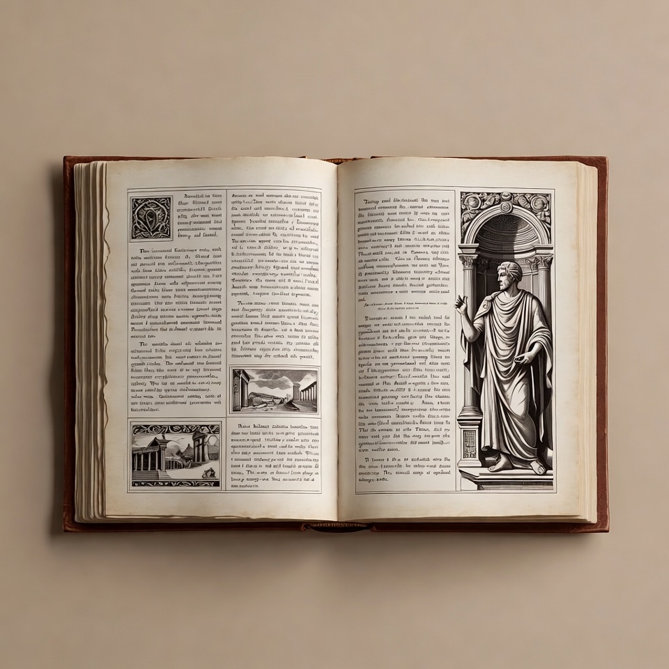 Open antique book with Roman man illustration