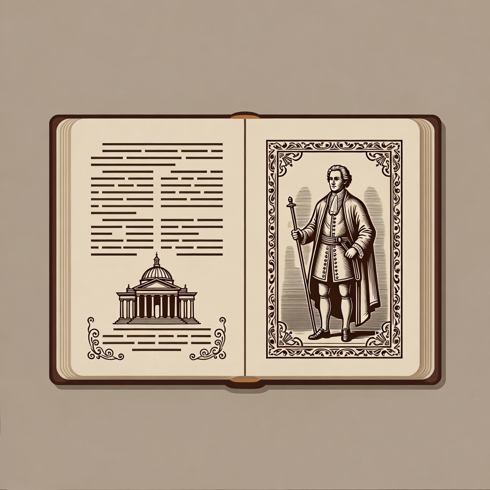 18th century, White, antique book, book pages, capitol building, classical architecture, columns, decorative borders, dome, engraving style, framed portrait, historical clothing, illustration, isolated background, line art, male, man, ornate frame, portrait, staff, text, vintage, open book