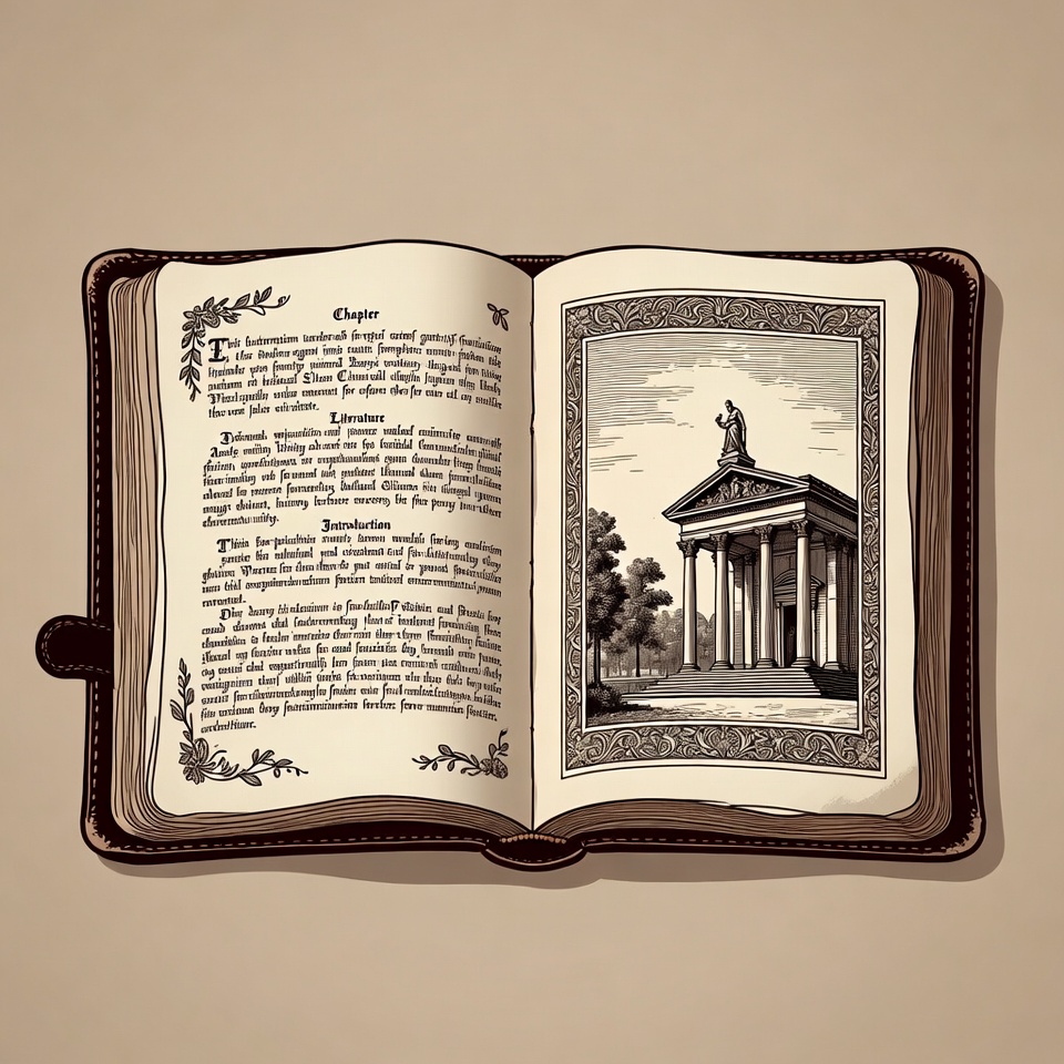 Greek temple, Parthenon, ancient temple, book, chapter page, classical architecture, clipart, columns, engraving, illustration, isolated background, leather book, ornate book, statue, trees, vintage book, open book