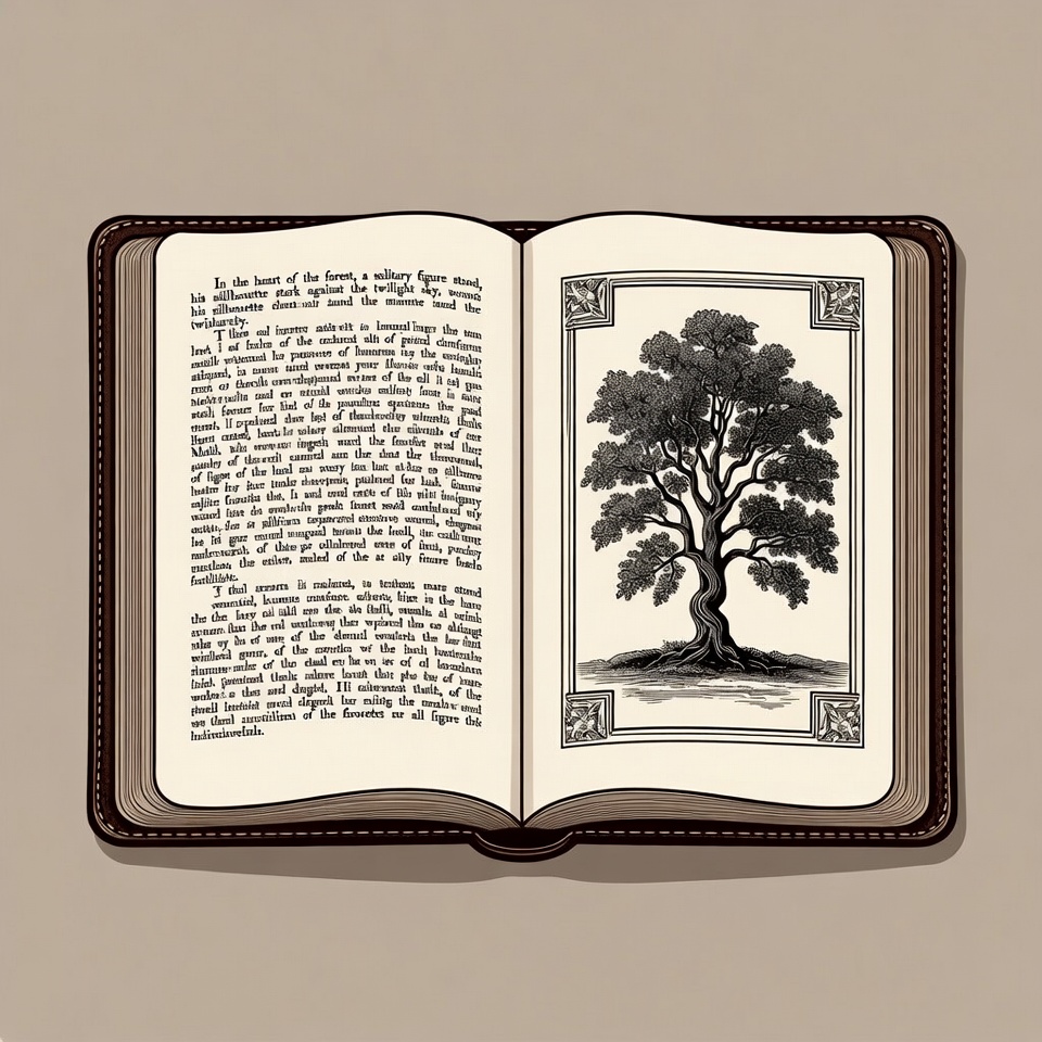 antique book, book page, clipart, foliage, illustration, isolated background, line drawing, literature, nature art, oak tree, ornate frame, reading, roots, tree illustration, trunk, vintage illustration, open book