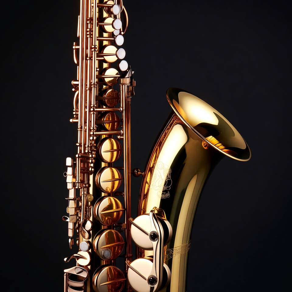 A shiny gold alto saxophone stands vertically against a black background. Its brass body gleams with polished highlights on the bell, keys, and neck. Detailed valves and engravings are visible along the curved instrument.