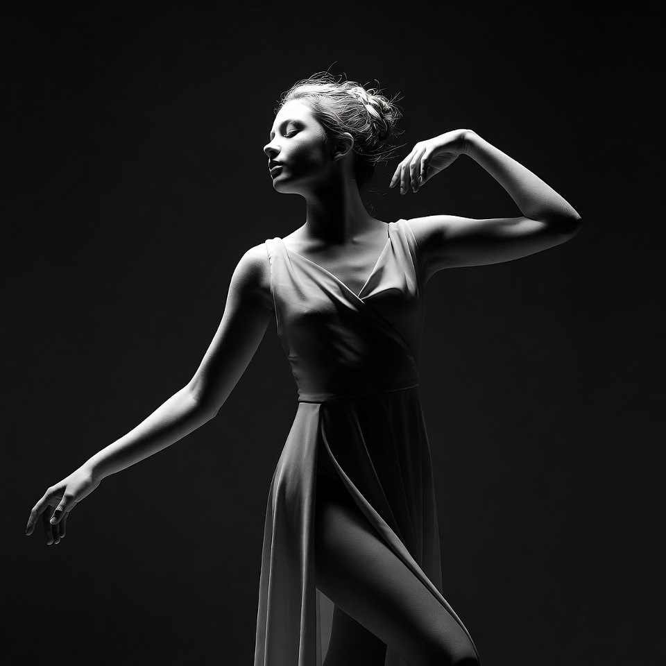A young woman with her hair in a loose bun performs a graceful dance pose in a black and white photograph. She wears a sleeveless, draped dress that flows elegantly as she extends her arms and one leg. Her face is turned sideways with a serene expression against a dark background.