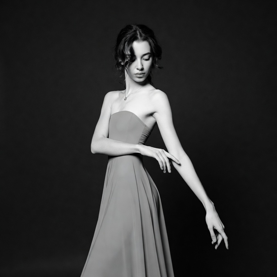 White, arms extended, black and white, black background, brunette hair, dancer pose, elegant pose, fashion, female, fingers pointed, flowing dress, graceful pose, necklace, portrait, slim figure, strapless dress, studio photo, wavy hair, young woman, woman