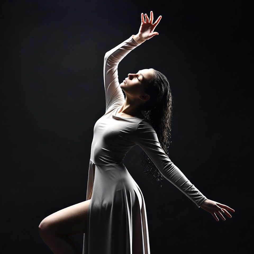 Multiracial, arched back, arm raised, black background, dance pose, dancing, dark hair, dramatic lighting, female, graceful pose, high slit, long sleeves, silhouette, wet hair, white dress, woman