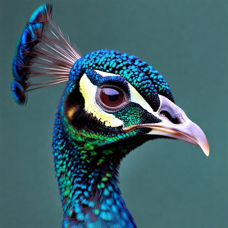 animal, beak, bird, blue feathers, closeup, crest, eye, feathers, green feathers, head, iridescent, isolated background, nature, peafowl, vibrant colors, wildlife, peacock