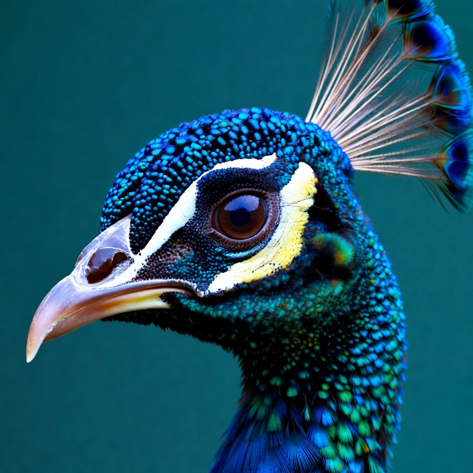 animal portrait, beak, bird, blue feathers, blue peacock, crest, eye, feathers, green background, head closeup, iridescent, peafowl, plumage, vibrant colors, wildlife, peacock