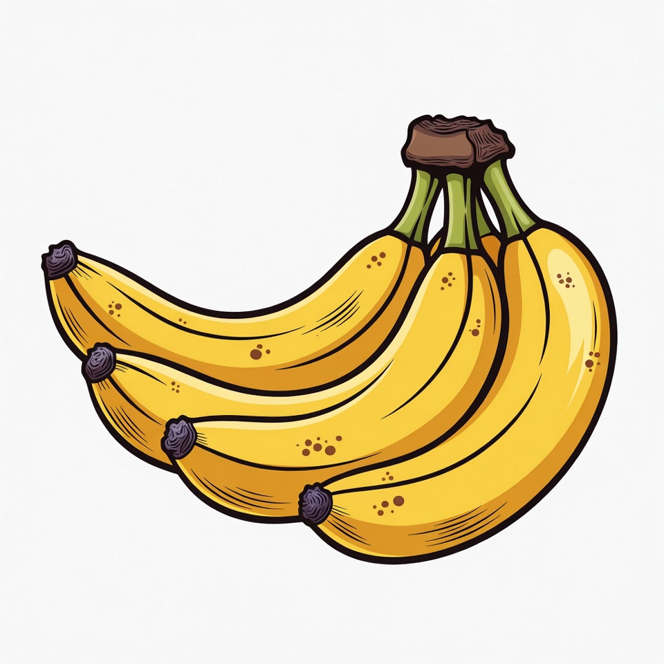 A vibrant clipart illustration features a bunch of four ripe yellow bananas with brown tips and green stems. The bananas are curved and detailed with small brown spots, arranged together on a transparent background. The hand-drawn style emphasizes smooth outlines and bright coloring.