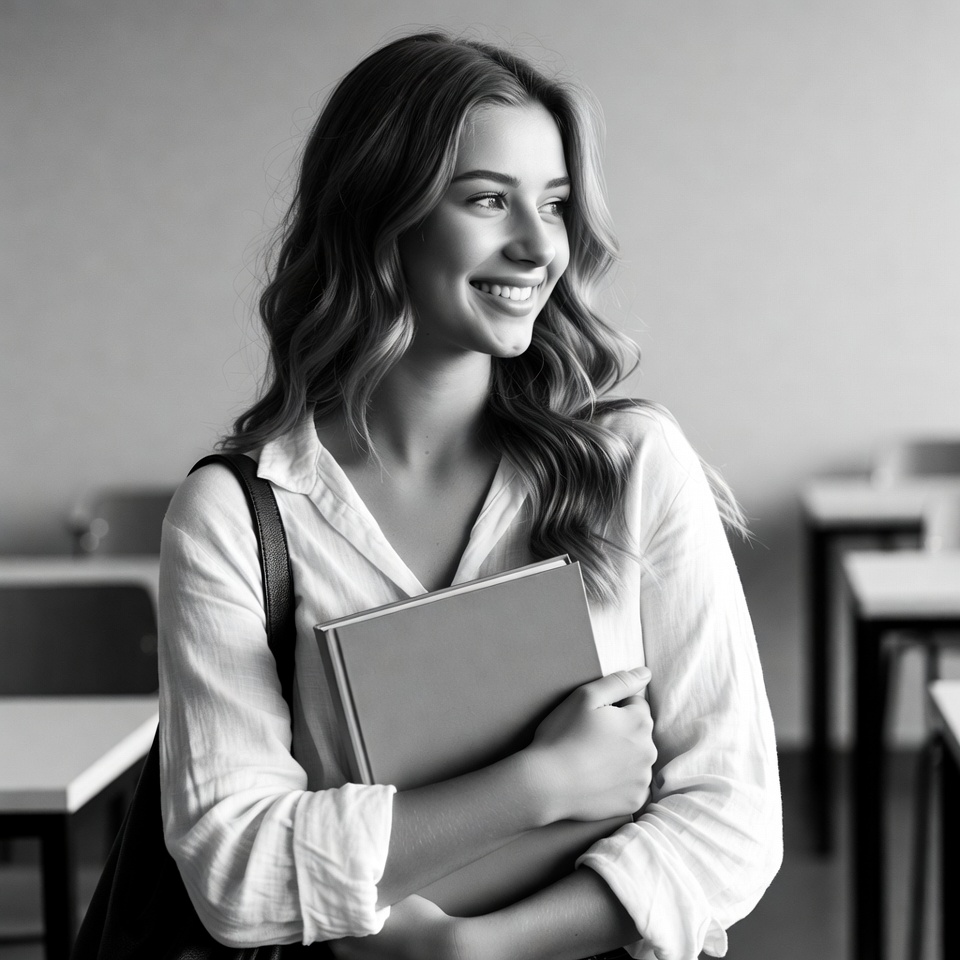 A young woman with long wavy hair smiles while holding a book against her chest in a classroom. She wears a white collared shirt and carries a backpack over one shoulder. Desks and chairs are visible in the background.