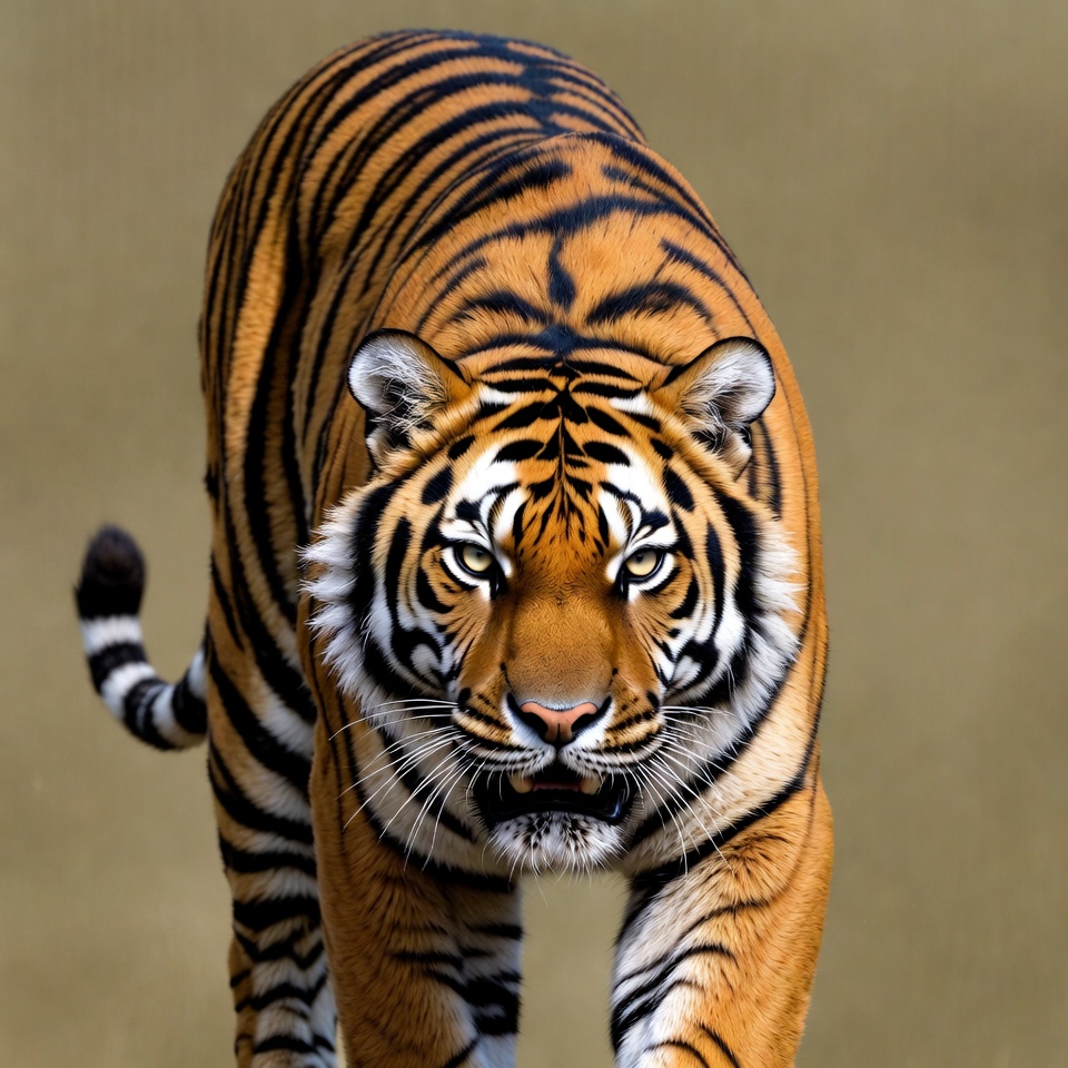 A Bengal tiger with vibrant orange fur and black stripes walks forward on a grassy field. Its intense yellow eyes stare directly ahead, and its mouth is slightly open showing teeth. The tiger's tail is raised and curved behind it.