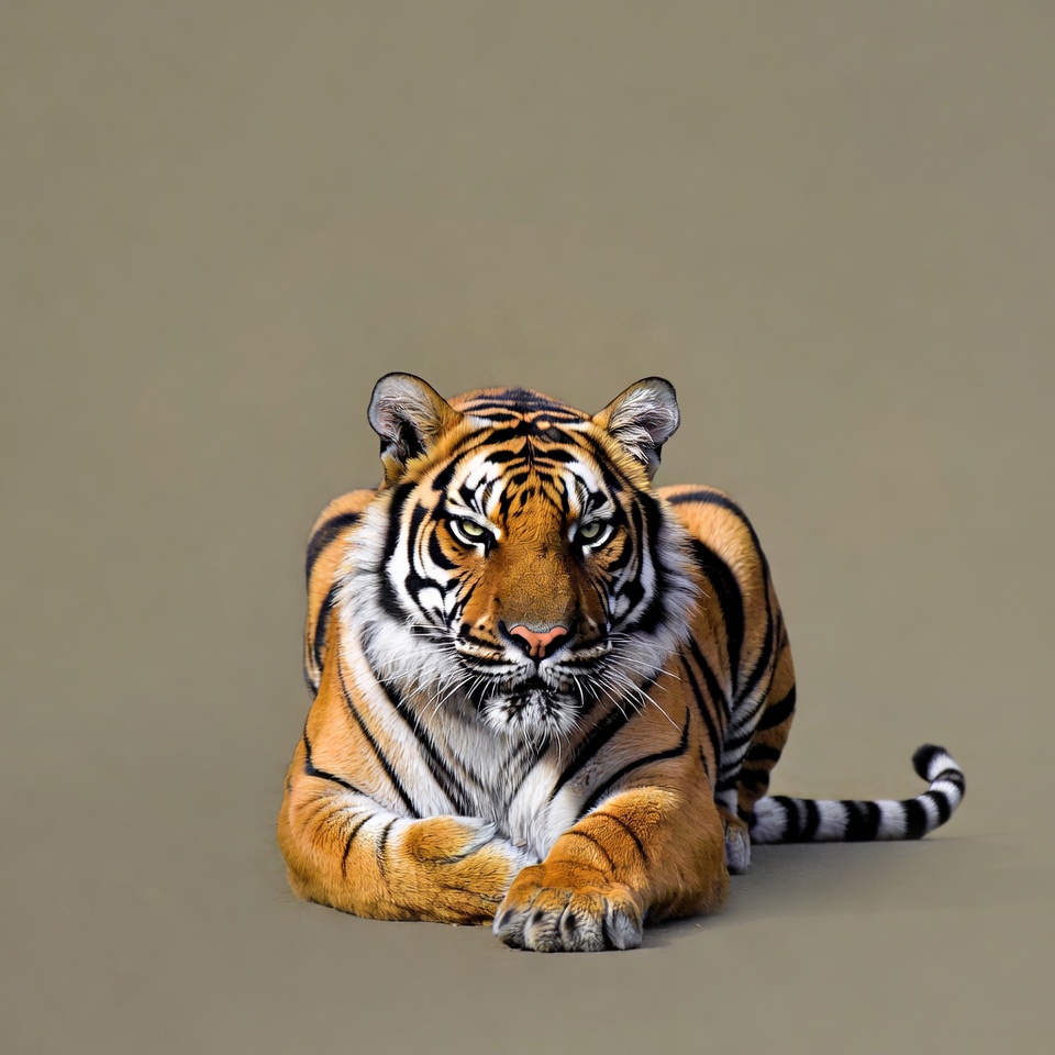 A majestic tiger with orange fur and black stripes lies on its stomach facing forward. Its intense eyes gaze directly at the viewer, with paws extended forward and tail curled behind. The tiger is positioned against a plain beige background.