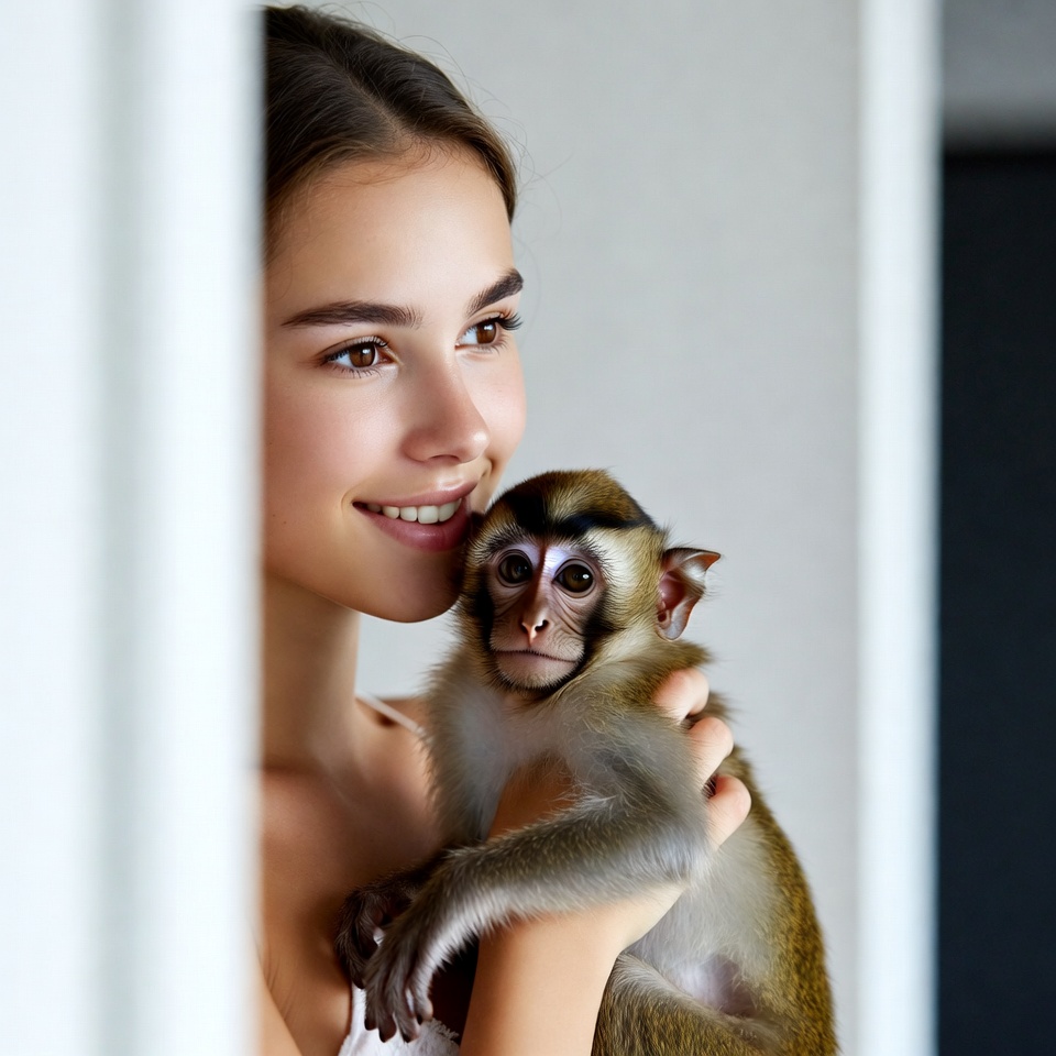 A young woman with long brown hair peeks from behind a white door while holding a small capuchin monkey. She smiles warmly at the monkey, which clings to her arms with its tiny hands. Both are viewed against a plain indoor background.