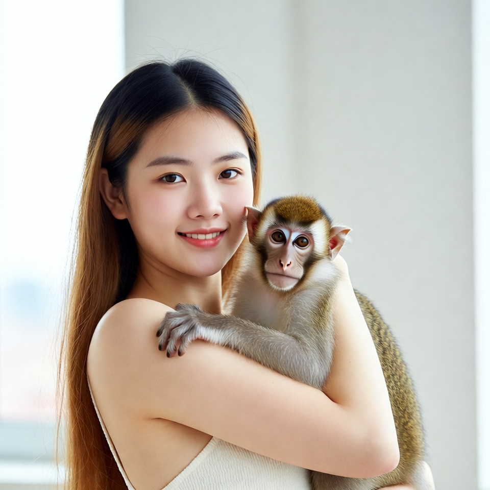 Asian, animal, arms around monkey, black hair, city view, cute monkey, female, gentle smile, holding monkey, indoor, light background, long hair, monkey, pet monkey, portrait, primate, smiling, straight hair, white top, windows, woman with animal, young woman, woman