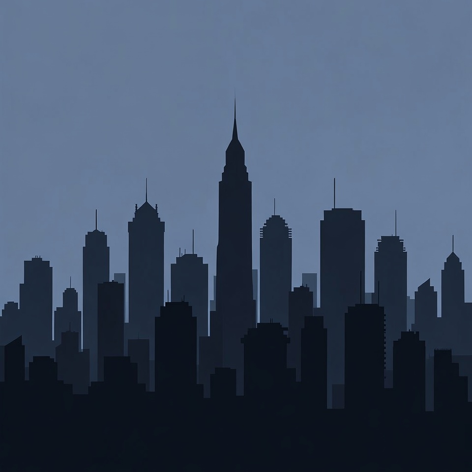 A dark silhouette of the New York City skyline against a gradient blue background. Prominent tall buildings including the Empire State Building are depicted in black outline. The illustration features various skyscrapers with spires and domes.
