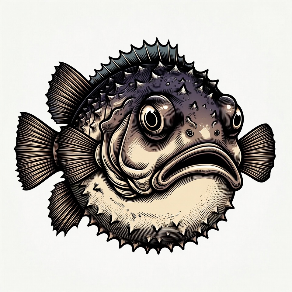 A detailed illustration of a pufferfish facing forward with large, wide eyes and a downturned mouth giving it a surprised expression. The fish features spiky protrusions around its inflated body, intricate fin details, and textured scales in shades of brown, beige, and dark accents. It is presented on an isolated white background.