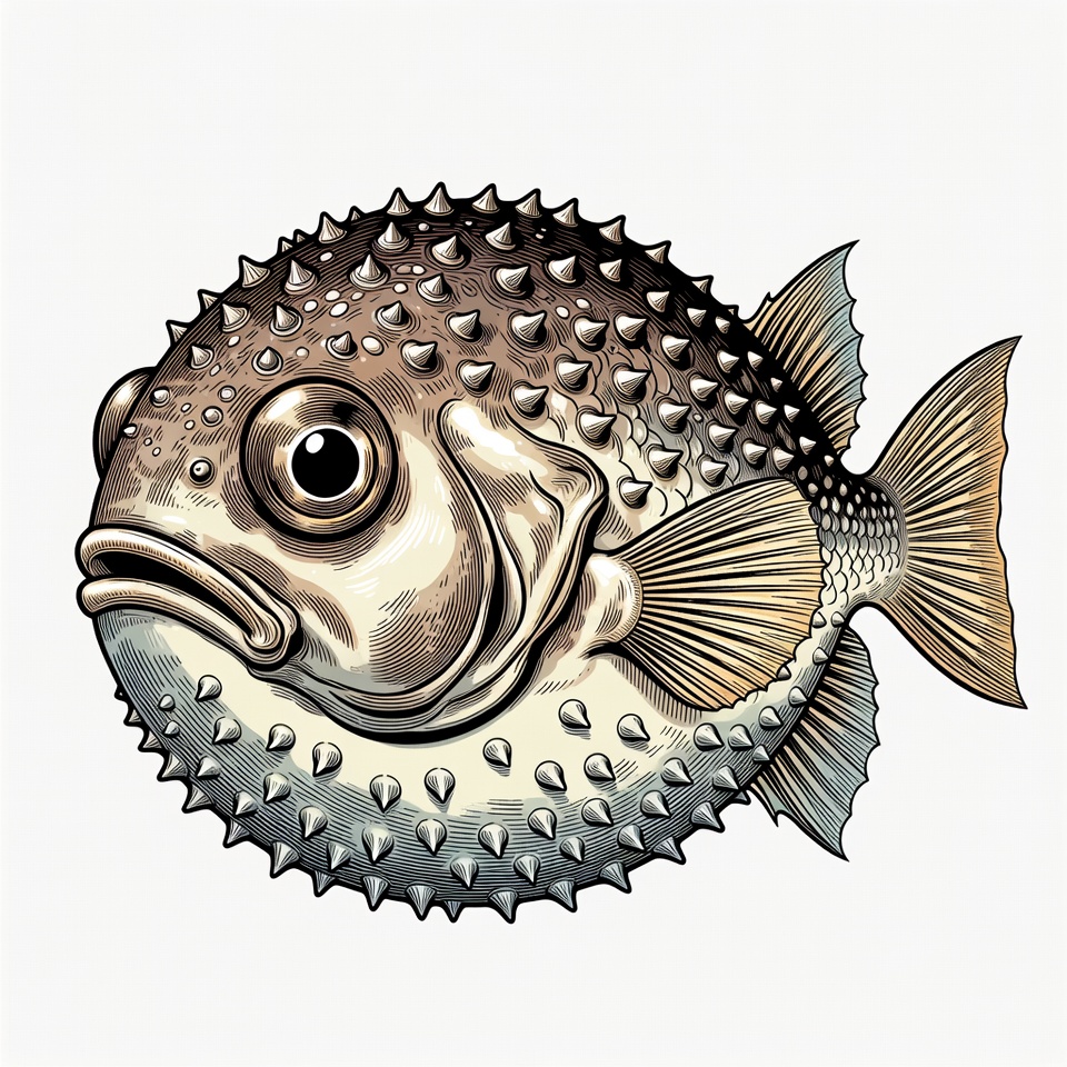 big eyes, blowfish, cartoon fish, detailed drawing, fins, fish illustration, illustration, isolated background, line art, marine animal, ocean fish, porcupine fish, sea creature, spikes, spiky fish, spiny puffer, white background, pufferfish