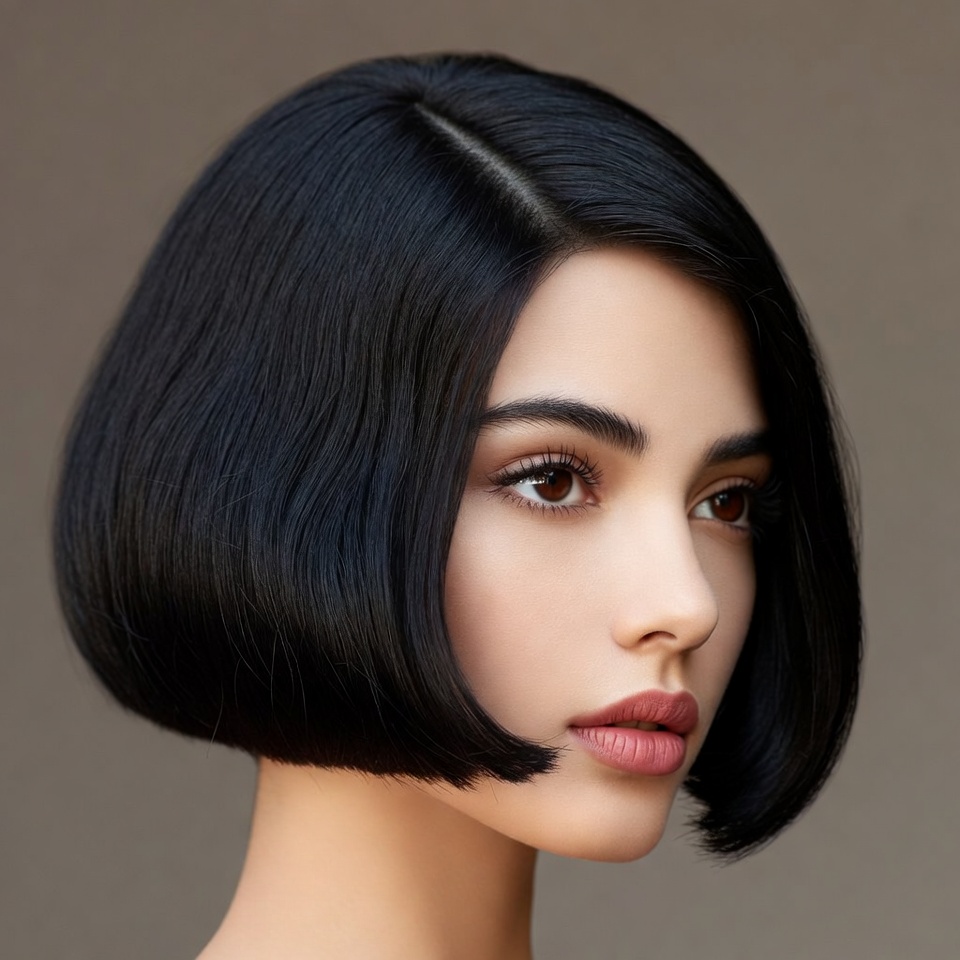 A young woman with straight black bob haircut poses in profile view against a neutral background. Her hair features a clean center part and falls evenly to chin length. She has subtle makeup with pink lips and brown eyes.
