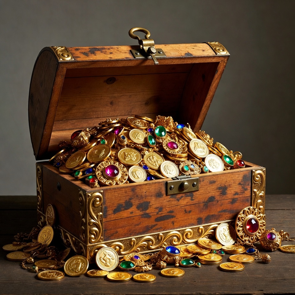 An antique wooden treasure chest with brass fittings sits open on a wooden surface. It overflows with shiny gold coins, colorful gemstones, and jeweled necklaces spilling out onto the table. The chest features intricate engravings and a sturdy lock.