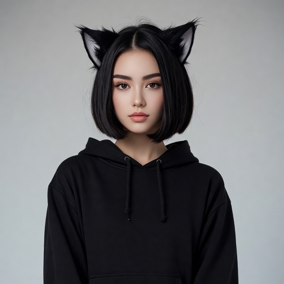 A young Asian woman with straight black bob haircut and subtle makeup stands against a plain gray background. She wears fluffy black cat ear headband and an oversized black hoodie. Her expression is calm with lips slightly parted.