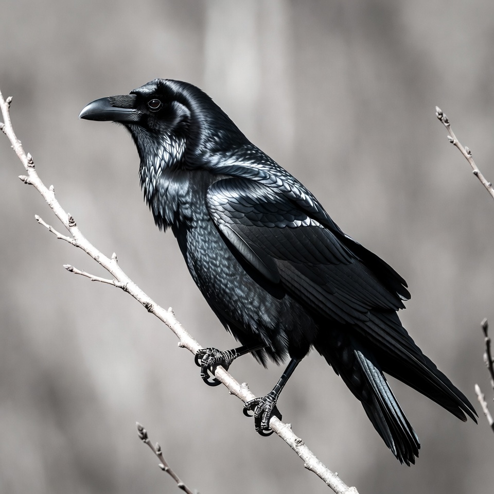A large black raven with glossy feathers perches on thin bare branches against a gray background. Its sharp beak and intense eyes face forward, with detailed iridescent plumage on its wings and body. The bird stands alert with talons gripping the twigs.