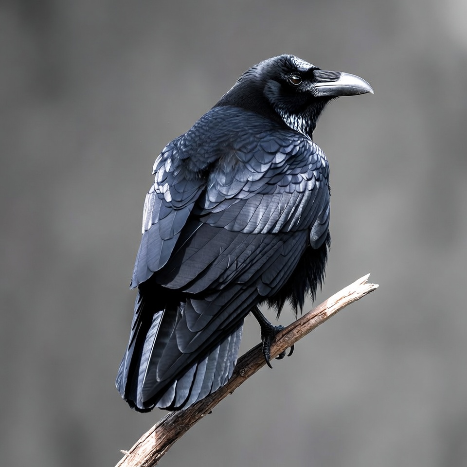 A large black raven with glossy feathers perches on a thin wooden branch. It faces slightly to the side with its sharp beak prominent and wings folded against its body. The bird is set against a soft gray background.