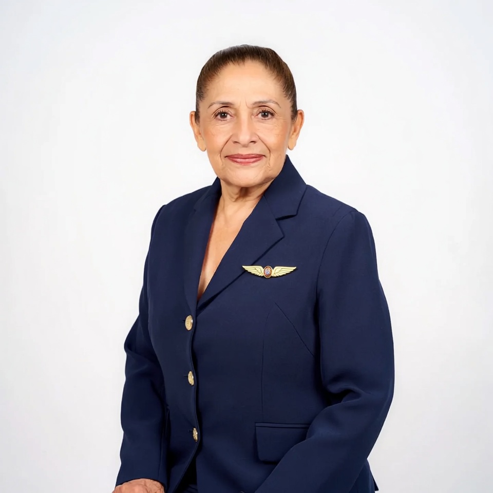 A middle-aged woman with dark brown hair in a bun smiles at the camera while wearing a navy blue flight attendant uniform. The uniform features gold buttons, a gold wing-shaped lapel pin, and a white blouse underneath. She stands against a plain white background.