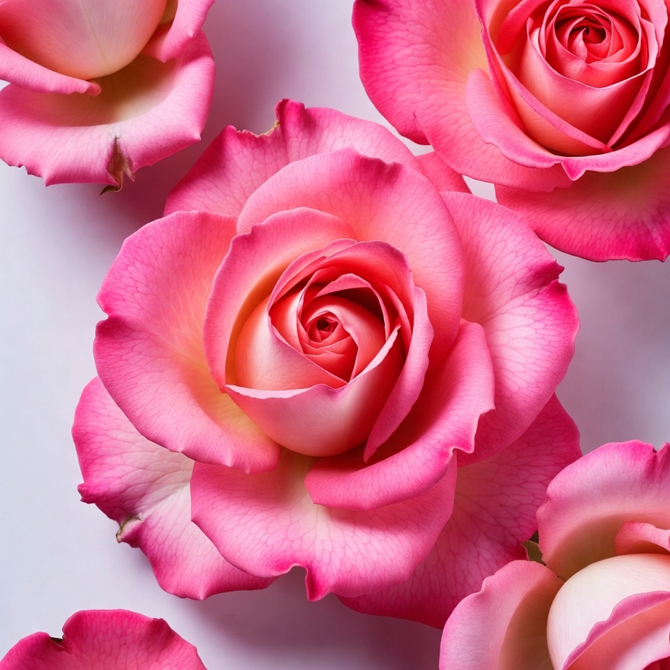 Several vibrant pink roses with layered petals are arranged on a plain white background. The flowers display soft gradients from deep pink to lighter shades, with some petals slightly open. They are scattered loosely, emphasizing their delicate textures and fresh appearance.