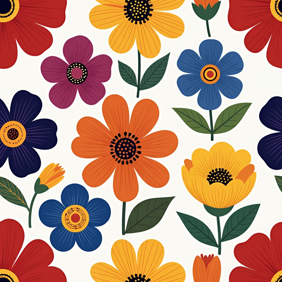 blue flowers, bright flowers, clipart, colorful flowers, daisy pattern, floral design, flower pattern, flower repeat, green leaves, illustration, isolated background, orange flowers, purple flowers, red flowers, seamless pattern, vector pattern, white background, yellow flowers, daisy flowers