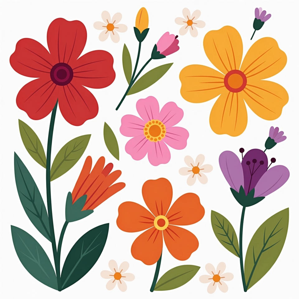 A vibrant illustration features various colorful flowers including red, yellow, pink, orange, and purple blooms. Green leaves and stems accompany the flowers on a white background. The flowers are arranged in a scattered, natural cluster.