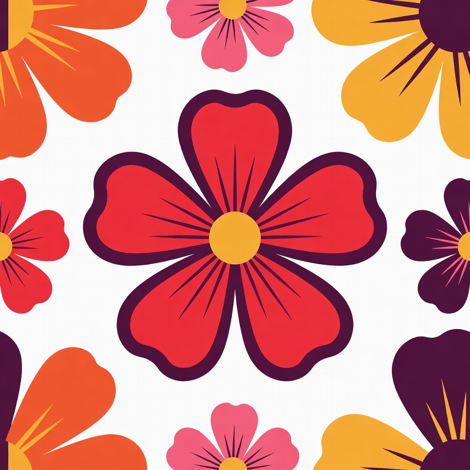 A vibrant clipart illustration features various large flowers in shades of red, orange, yellow, pink, and purple arranged in a repeating pattern. Each flower has bold outlines and bright centers on a clean white background. The design creates a seamless floral motif ideal for patterns.